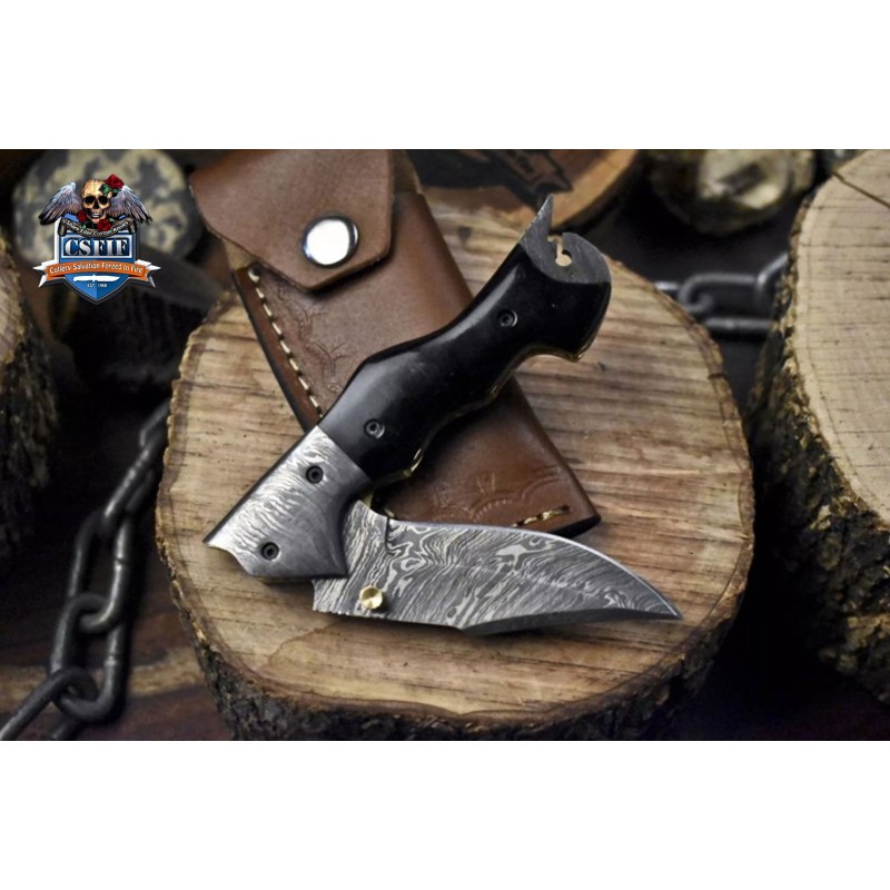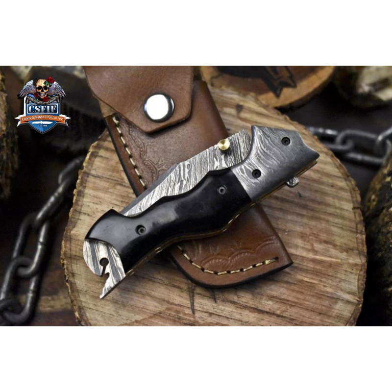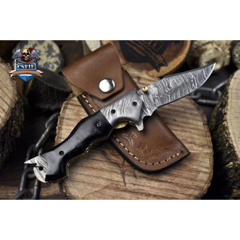 Experience craftsmanship and functionality with this handmade Twist Damascus Folding Knife, ideal for EDC and collectors alike. Forged from a blend of 1095 and 15N20 steel, the blade showcases a mesmerizing twist pattern with flowing lines and bold contrast, created by repeated folding and acid burning for striking visual depth and enhanced strength. The bull horn handle is naturally sourced, polished to a high gloss, and offers a strong, ergonomic grip with a rustic aesthetic. A Damascus bolster lock ensures secure blade deployment while adding to the knife’s unique appeal. With a compact 7-inch overall length, this pocket-sized tool is easy to carry yet delivers big on performance. Whether you're an outdoor enthusiast, craftsman, or knife aficionado, this folding knife is a reliable, eye-catching companion.