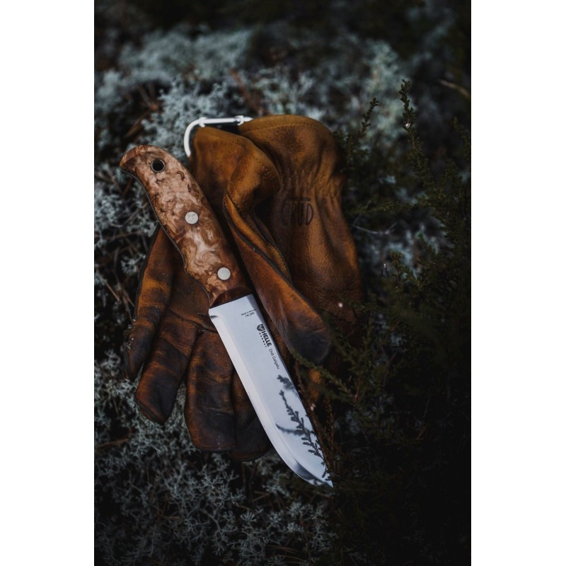 The polished 14C28N stainless steel blade features a 90° spine for ferro rod striking and is ground in a classic Scandinavian style. At 3 mm thick, the full-tang construction ensures strength for chopping while remaining precise for carving. The contoured curly birch handle offers a secure grip for medium to large hands and is fixed with brass rivets and a lanyard hole.