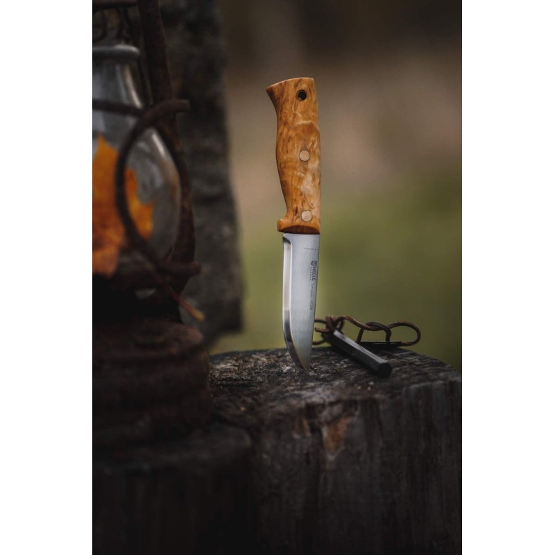 Its full-length, ¾-wide tang adds durability without compromising cold-weather comfort. Paired with a hand-shaped curly birch handle and securely fixed with brass rivets, the Temagami feels just right in the hand—balanced, grippy, and beautiful. The updated design also includes a premium tan leather sheath for safe and stylish belt carry.