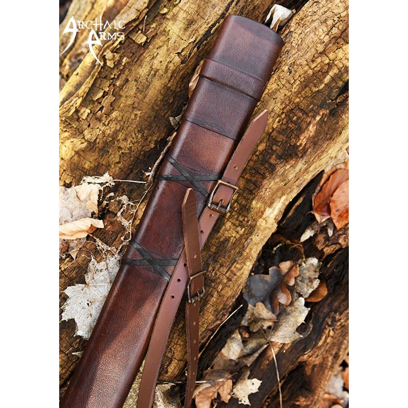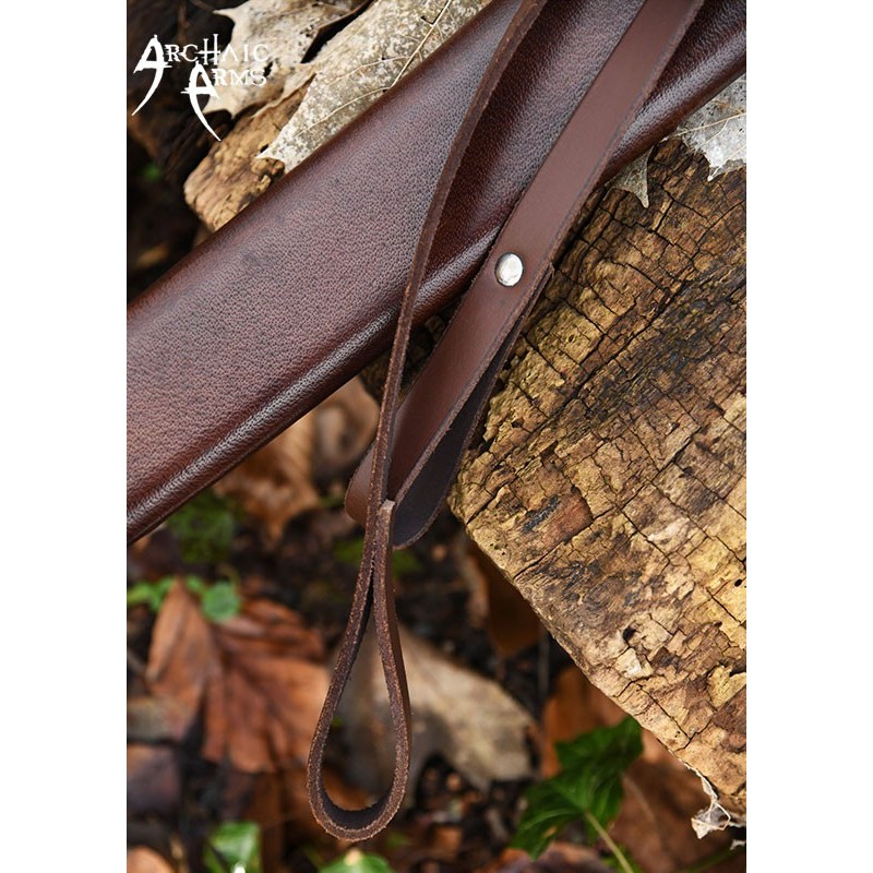 The broad hilt is wrapped in high-quality leather, delivering an authentic grip and enhanced handling in battle. The accompanying wooden scabbard is wrapped in genuine leather and features two adjustable straps with buckles, allowing it to be securely fastened to your belt or harness. This impressive Viking weapon is perfect for collectors, reenactors, and history enthusiasts seeking a genuine piece of Norse heritage.