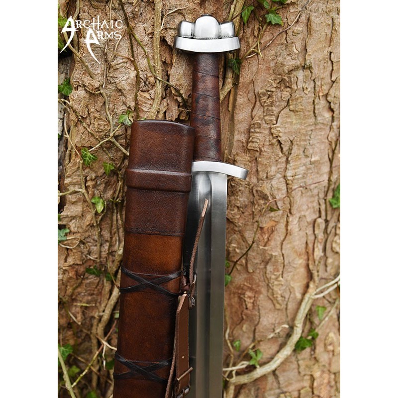 The double-edged spring steel blade (EN45) is oil-tempered to 48-50 HRC, making it durable yet flexible. The wide fuller reduces weight without compromising strength, ensuring optimal balance and maneuverability. The guard and iconic three-lobed pommel are handcrafted from heat-treated malleable cast iron, providing historical accuracy and durability.