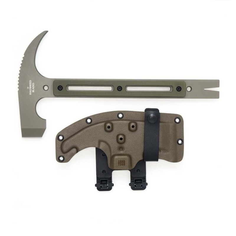 Built for the toughest missions, the MFE-01 Rhino Tool by Halfbreed Blades is a compact, multi-functional MOE (Method of Entry) tool engineered for military, law enforcement, and rescue professionals. Designed originally for the Special Operations Engineer Regiment (SOER), this NATO-stocked tool is constructed from Austrian Bohler K110 (D2) tool steel and features a one-piece full tang for extreme strength and durability. From chopping and prying to smashing locks and windows, the MFE-01 is purpose-built for critical tasks. Its modified claw head and compact cutting edge offer excellent leverage and splitting power, while the skeletonized design improves weight distribution. Low-profile G10 scales and an extra-large finger choil ensure superior grip and control. Complete with a precision-molded MOLLE-compatible Kydex sheath, this tool is battle-ready. Whether in the field or on standby, the Rhino Tool delivers uncompromising performance in a compact form factor.